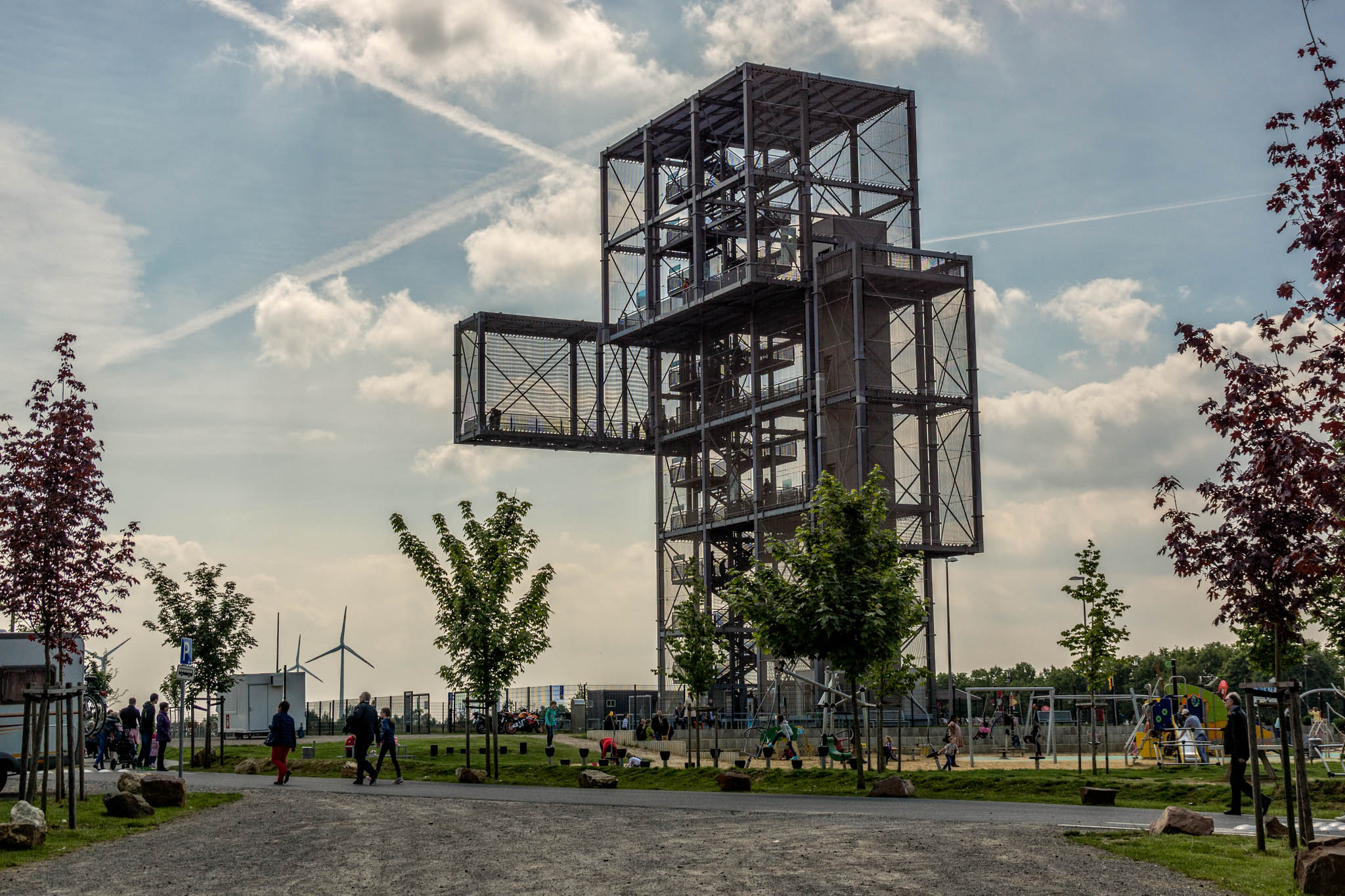 Auf der Rückfahrt aus Aachen machten wir Pause am Indenmann. Einem Aussichtsturm über dem Tagebau Inden mit grandiosem Spielplatz!